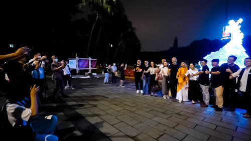 開幕式上,來自廣州市林業(yè)和園林局副局長(zhǎng)陳迅、廣東廣播電視臺(tái)副臺(tái)長(zhǎng)曾少華、廣州市文化廣電旅游局副局長(zhǎng)柯顯東、廣州市越秀公園主任王艾君和夜空彩虹集團(tuán)總裁杜海燕通過由夜空彩虹設(shè)計(jì)的心型Feng巢啟動(dòng)裝置,共同啟動(dòng)了“看見光——光藝術(shù)節(jié)”。