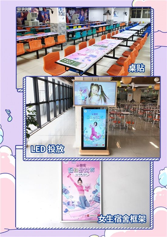 朵蕾蜜首次在全國范圍內(nèi),與21所大學(xué)聯(lián)手傳播推廣;除了在各大高校的生活區(qū)植入活動(dòng)主題海報(bào)外,還在大學(xué)的LED屏幕、微博、微信、騰訊…等直接觸達(dá)年輕人的平臺,投放MV。借助開學(xué)季契機(jī),希望能更全面、更精準(zhǔn)地與每位剛開學(xué)、入學(xué)的小姐姐“對話”,讓更多人看到和感受到,來自朵蕾蜜的元?dú)夤膭?lì)。