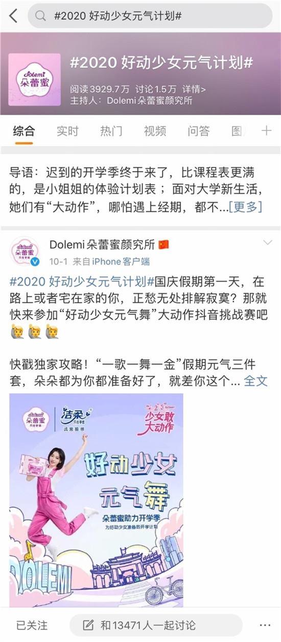 各大高校終于陸續(xù)上線營業(yè)!因?yàn)橐咔樵?今年的開學(xué)季遲遲未到,這屆新生,因此“囤”起了許多愿望和計(jì)劃;面對大學(xué)新生活,她們有許多“大動(dòng)作”等待實(shí)現(xiàn)。朵蕾蜜作為中順潔柔旗下,集獨(dú)特、創(chuàng)新和天然健康的女性護(hù)理用品品牌,一直堅(jiān)持“只在乎您”的品牌理念,陪伴著每個(gè)少女成長,在乎身心每個(gè)細(xì)微的感受。在這個(gè)特殊的開學(xué)季,朵蕾蜜發(fā)起#2020好動(dòng)少女元?dú)庥?jì)劃#,推出活動(dòng)主題“少女敢大動(dòng)作”,想以一場元?dú)庑袆?dòng),支持和鼓勵(lì)少女:不要被經(jīng)期打擾自己的大動(dòng)作、大計(jì)劃,盡情體驗(yàn)大學(xué)生活。