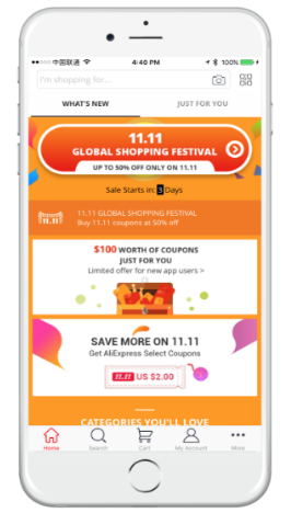 而App Annie在去年介紹過(guò)的國(guó)際批發(fā)平臺(tái)全球速賣(mài)通 (Aliexpress) 也證明了阿里巴巴正在全力將 “雙十一”購(gòu)物節(jié)推向海外的移動(dòng)消費(fèi)者。該應(yīng)用不但隆重推出 “雙十一”購(gòu)物節(jié)專(zhuān)題,而且引入了大受中國(guó)消費(fèi)者歡迎的新技術(shù),例如視頻直播。