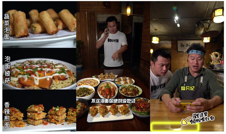 游戲行業(yè)客戶由于需要詳細介紹游戲福利,進行較長時間的口播植入,適合選擇擅長中長視頻創(chuàng)作的達人進行合作。游戲產(chǎn)品仙凡紀(jì)選擇了與美食垂類的達人“尋真味佬美”合作。合作視頻的主題為泡面的花式做法,總長度接近5分鐘,前3分鐘內(nèi)容完全沒有產(chǎn)品信息植入,在3分05秒的時候,趁達人將所有的食材制作完畢等待出鍋的時間間隙,自然植入游戲體驗和展示的環(huán)節(jié)。
