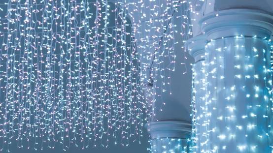 在整體外墻、中庭燈簾、入口護(hù)欄、通道亮化上,夜空彩虹設(shè)計(jì)團(tuán)隊(duì)用星星燈打造了一個(gè)具有高格調(diào)的商場(chǎng)夜景氛圍。
