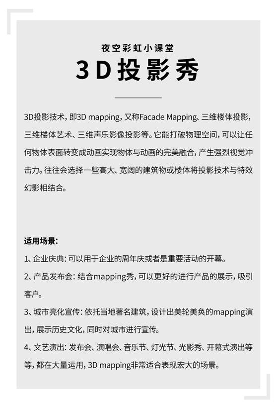 面對(duì)如此具有潛力的市場(chǎng),以“燈光+”為特色的夜空彩虹在今年正式引入3D投影秀,并在相關(guān)實(shí)際項(xiàng)目中印證了這項(xiàng)創(chuàng)意燈光表現(xiàn)形式的無限魅力。