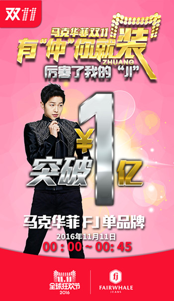 自雙11開場的45分鐘內(nèi),馬克華菲FJ單品牌銷售額已經(jīng)突破1億元,刷新去年雙11戰(zhàn)績。