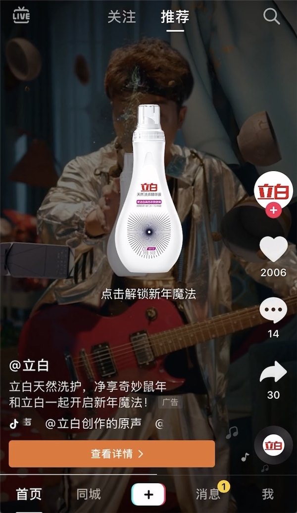 有消息透露,《新春時光機(jī)》主題曲首發(fā)席位已被立白鎖定。這已經(jīng)是立白第二次攜手《新春時光機(jī)》聯(lián)合共創(chuàng)。在去年的合作中,立白搭載“趣動浮層+極速推廣頁”的創(chuàng)新廣告形式,與《新春時光機(jī)》完成了與用戶的強(qiáng)交互。今年立白再次與全面升級的《新春時光機(jī)》牽手,在春節(jié)檔解鎖更多優(yōu)質(zhì)潮流內(nèi)容,實現(xiàn)品牌影響力的躍遷。