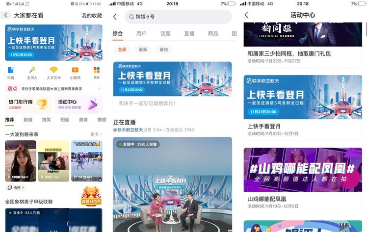 自2018年全面開啟商業(yè)化以來,快手以“短視頻+直播”雙引擎為核心驅(qū)動力,以不斷進(jìn)化的優(yōu)質(zhì)內(nèi)容生態(tài)為基礎(chǔ),深耕各大垂類領(lǐng)域,不斷刷新行業(yè)新紀(jì)錄。此次嫦娥五號項目,更是實(shí)現(xiàn)了快手在軍事領(lǐng)域航空航天垂類的布局升級,進(jìn)一步增強(qiáng)平臺的內(nèi)容格調(diào)和建設(shè)能力。