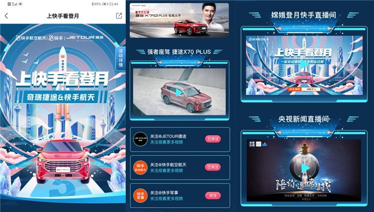 結(jié)合嫦娥五號發(fā)射這一全民關(guān)注的熱點(diǎn)事件,快手磁力引擎為捷途汽車定制了多維立體式傳播新玩法,打通了從品牌曝光、產(chǎn)品種草到口碑提升、銷售轉(zhuǎn)化的全鏈路營銷閉環(huán)。