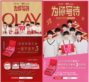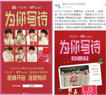 此次活動(dòng)時(shí)間跨度較長(zhǎng),足以見得OLAY對(duì)其的用心程度。從12月初便開始籌備,前期先在OLAY官方微博預(yù)告時(shí)代少年團(tuán)全新mv海報(bào),帥氣的少年們吸引了大批粉絲,為后期直播蓄力積攢人氣,粉絲可觀的消費(fèi)力引爆旗艦店的流量。