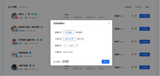 新版本中,客戶在達人廣場選定達人后,可以根據(jù)營銷場景自主選擇直播方式和計費方式,專場直播按小時/按天計費,拼場直播按推廣商品個數(shù)計費。這個功能的上線大大滿足了不同品牌在不同場景下的營銷訴求,如需要沉浸式推廣時可以選擇專場合作,而想要大范圍帶貨轉(zhuǎn)化時選擇拼場合作。