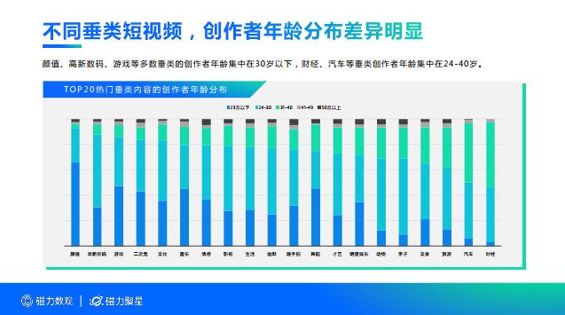 其中,短視頻發(fā)布數(shù)量增長(zhǎng)強(qiáng)勢(shì),2020年6-11月,發(fā)布量提升達(dá)142.8%。并且短視頻內(nèi)容覆蓋影視、游戲、高新數(shù)碼、二次元、汽車等多個(gè)垂直領(lǐng)域,不同垂類的創(chuàng)作者畫像在性別、年齡等層面差異化明顯。如顏值、高新數(shù)碼、游戲等多數(shù)垂類的創(chuàng)作者年齡集中在30歲以下,財(cái)經(jīng)、汽車等垂類創(chuàng)作者年齡集中在24-40歲。