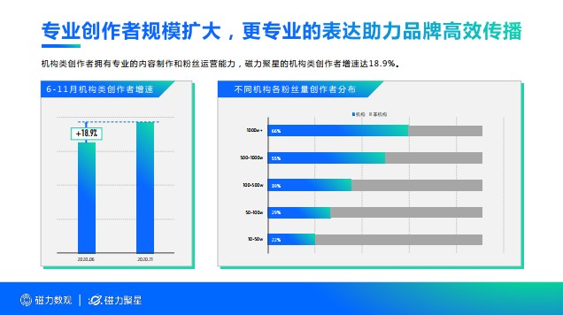 除了普通創(chuàng)作者,快手上專業(yè)創(chuàng)作者的力量也不容小覷。2020年6-11月,磁力聚星的機(jī)構(gòu)類創(chuàng)作者增速達(dá)18.9%,粉絲量為1000w+的創(chuàng)作者中機(jī)構(gòu)號(hào)占比達(dá)66%,展現(xiàn)出機(jī)構(gòu)創(chuàng)作者在品牌傳播方面的權(quán)威性和專業(yè)度,而越來(lái)越多創(chuàng)作者也選擇在短視頻內(nèi)容創(chuàng)作的基礎(chǔ)上開通直播,做到種草帶貨兩不誤。