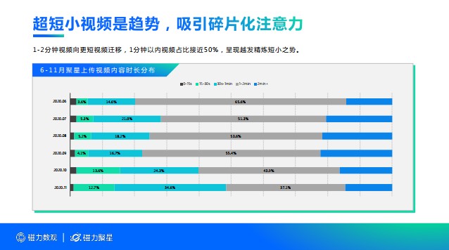 當(dāng)下,用戶注意力越來(lái)越碎片化的消費(fèi)趨勢(shì)也不容忽視,《報(bào)告》顯示,快手上1-2分鐘視頻向更短視頻遷移,1分鐘以內(nèi)視頻占比近半數(shù),通過(guò)越發(fā)精煉短小的視頻形態(tài),快手成功收割用戶被打碎的注意力。