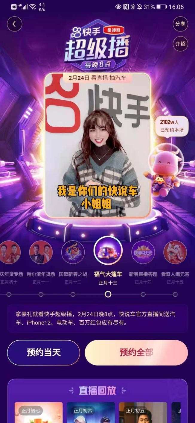 春節(jié)假期已過,而快手帶來的璀璨星光與內(nèi)容盛宴尚未落幕。自2月1日起,在各大城市“年貨專場”、星素結(jié)合“牛人之夜”、精彩短劇爆棚的“初五劇好看”等每天都不停歇的大牌節(jié)目之后,快手“超級播”還會持續(xù)提供更多新鮮內(nèi)容。2月24日,也就是大年十三晚8點,“快說車”將帶來知識問答專場“福氣大篷車”,向現(xiàn)場觀眾分享普及汽車知識的同時,帶來包括特斯拉在內(nèi)的抽獎大禮!目前已有超過兩千萬人預(yù)約本場直播,可見人氣爆棚。