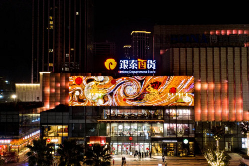 寧波銀泰環(huán)球城是銀泰商業(yè)全國首座環(huán)球城項目,其外立面的面積超2000㎡,是此次項目外立面中面積最大的商場。