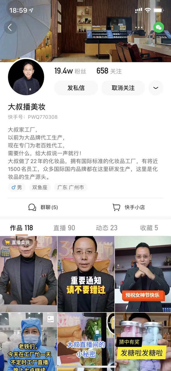 經(jīng)過(guò)和股東們討論,龐文強(qiáng)開(kāi)始了自己“主播”生涯。他形象得體,表達(dá)能力好,時(shí)常跟辦公室的年輕人拍攝短情景劇廣告,屬于有一定網(wǎng)感的中年大叔。他給自己的快手賬號(hào)取名就叫做“大叔播美妝”。
