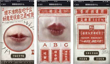 為了給吃貨節(jié)預(yù)熱,1號店推出了測試類H5。給出一個正在吃東西的嘴型,下面有ABC三個選項,用戶需要根據(jù)嘴型判斷在吃什么,如果全部答對,則被鑒定為“資深吃貨”,用戶可以領(lǐng)取吃貨福利,輸入姓名和手機(jī),參與互動抽獎,有機(jī)會獲得1號店517吃貨節(jié)大禮。