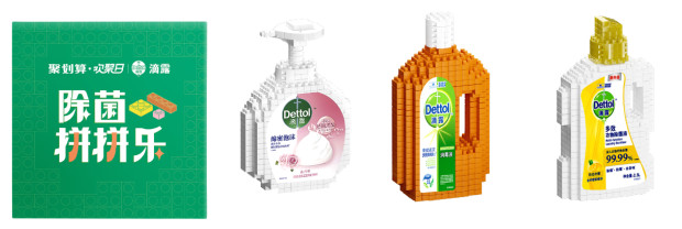 除了別具一格的除菌課本,禮盒里還附贈(zèng)了滴露三款主打產(chǎn)品的微顆粒積木。消費(fèi)者可以自己動(dòng)手拼裝,在重溫童年樂(lè)趣的同時(shí)也再一次加深了對(duì)于滴露產(chǎn)品的印象,將產(chǎn)品的功能利益點(diǎn)銘記于心。