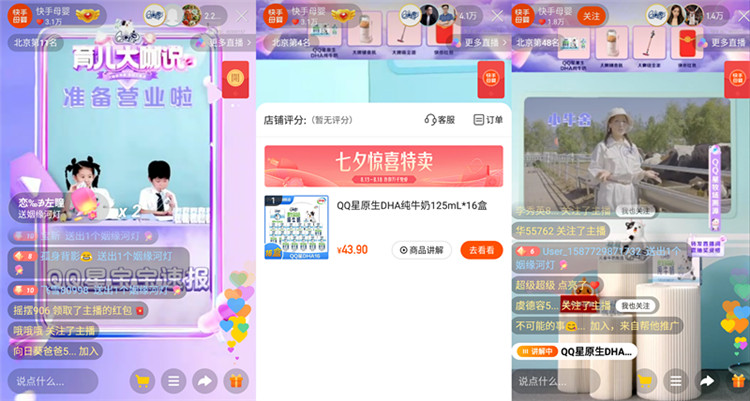 直播中,快手母嬰一方面通過育兒大咖口播、QQ星原生DHA純牛奶產(chǎn)品露出,以及QQ星寶貝速報、QQ星育兒寶典等各大環(huán)節(jié)的視頻、KT板,直播間禮物贈送、“小黃車”上架等多重方式,增強品牌聲量,直接刺激消費。