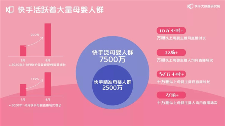 據(jù)《2020快手母嬰生態(tài)報告》顯示,快手泛母嬰人群達7500萬,精準母嬰人群達2500萬;萬粉以上母嬰主播月直播時長超過10萬小時,人均月直播場次超過22場;10萬粉以上母嬰主播月直播時長超過3.7萬小時,人均月直播場次超過27場。