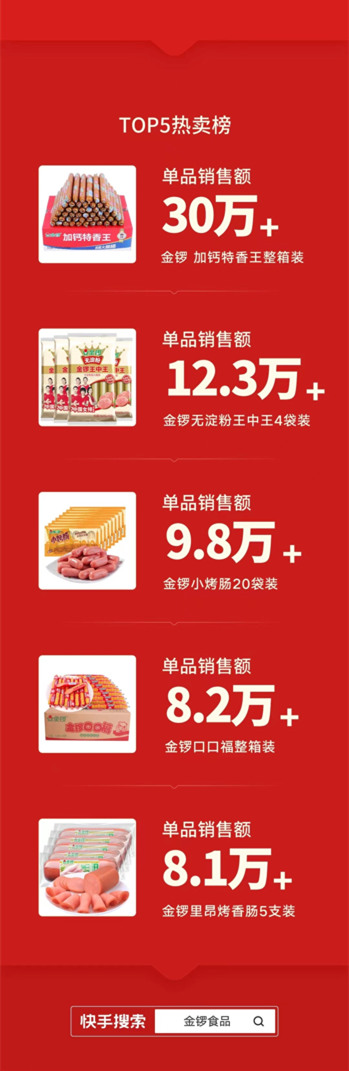 如此亮眼的成績也離不開品牌的充分準備與快手磁力金牛的大力扶持。在活動預(yù)熱期,金鑼投入大量精力,推出了一系列預(yù)熱視頻。在精細化制作的種草視頻中,主播在金鑼總部為用戶展示火山石烤腸、肉粒多等爆款產(chǎn)品,并為觀眾提供即將到來的活動商品清單和營銷玩法,并進行福利價格預(yù)告。