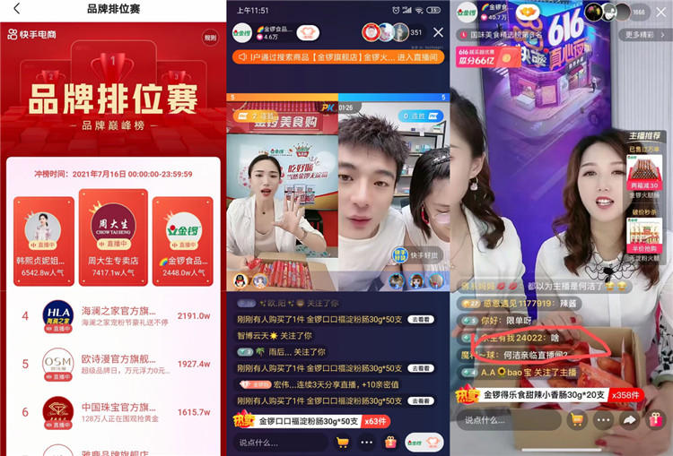 除了靠快手磁力金牛投流沉淀私域流量,金鑼食品也積極參與平臺的各類電商營銷活動,在投流中增加自身曝光度,擴大公域流量。7月16日的品牌排位賽中,金鑼食品憑借2448W人氣奪得巔峰榜第三位;快手616真心夜晚會過程中,金鑼食品直播間實時熱度將直播間提升至國味美食精選榜第三名;金鑼食品還與快手好貨官方賬號直播連麥,為自己的直播間引流。此外,金鑼食品也踴躍參與了奪金日、七夕節(jié)等活動,持續(xù)與粉絲加強互動。