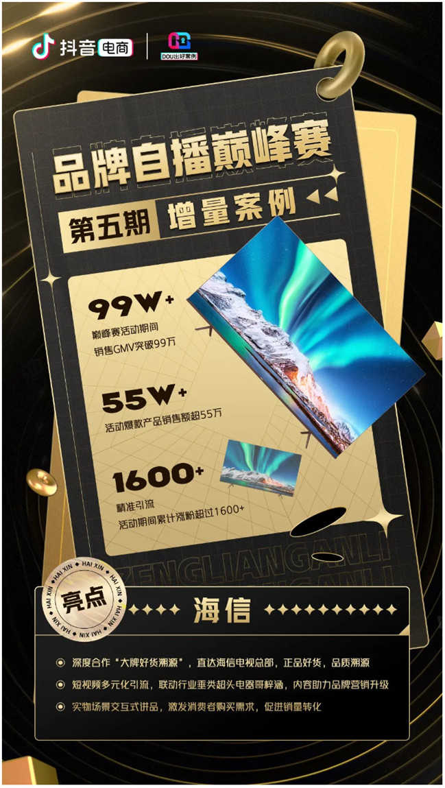 “通過行業(yè)同學的引導(dǎo),我們報名參加了第五期自播巔峰賽。前期我們就和抖音電商保持了高度的溝通,積極備戰(zhàn)。直播間采用了海信電視的總部展廳作為背景,向消費者充分展示了海信的產(chǎn)品是怎么生產(chǎn)出來的,加深了他們對海信的品牌認知。我們希望,以后在需要家電的時候,他們能夠第一時間就想到海信。”海信電視電商副總經(jīng)理李凝燁表示。