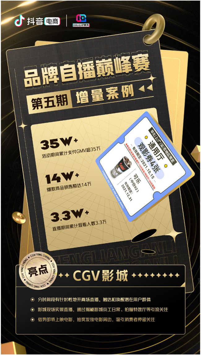 CGV影城,過去的業(yè)務(wù)一直以線下為主。在影城因疫情停業(yè)期間,CGV團隊思考如何突破傳統(tǒng)渠道的束縛時,抖音開始進入他們的視線。去年11月,CGV入駐抖音電商并搭建了直播團隊,主要售賣電影套票,觀影券和爆米花的小食組合等。