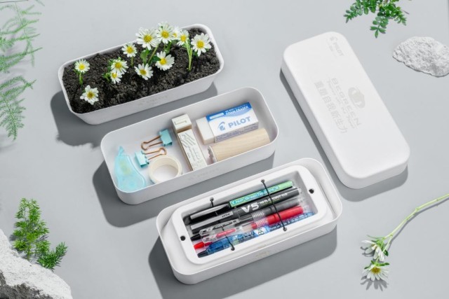 禮盒內(nèi)部還隨機(jī)搭配植物種子,內(nèi)托上寬下窄,填入土壤后便可搖身變成植物槽,百樂巧妙的設(shè)計讓廣大學(xué)子在綠色書寫的同時也能體驗自然種植的樂趣。禮盒外殼采用原木漿與甘蔗漿的混合材質(zhì)制作,具有良好的可降解性,可以說「百樂新生禮盒」將“重塑新生”的理念貫徹到底。