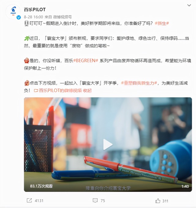 作為享譽(yù)全球的百年文具品牌,百樂也肩負(fù)起社會責(zé)任,以自身行動為生態(tài)環(huán)境助力,將可循環(huán)利用的理念深入消費者心中。百樂BEGREEN作為百樂品牌響應(yīng)保護(hù)地球環(huán)境而設(shè)立的產(chǎn)品系列,通過利用可回收材料進(jìn)行產(chǎn)品生產(chǎn),以此減輕因廢料產(chǎn)生帶給地球的環(huán)境壓力。恰逢9月開學(xué)季,百樂開展了一場名為【重塑自我新生力】的主題活動,引導(dǎo)大眾踐行可持續(xù)理念,暢享綠色生活。