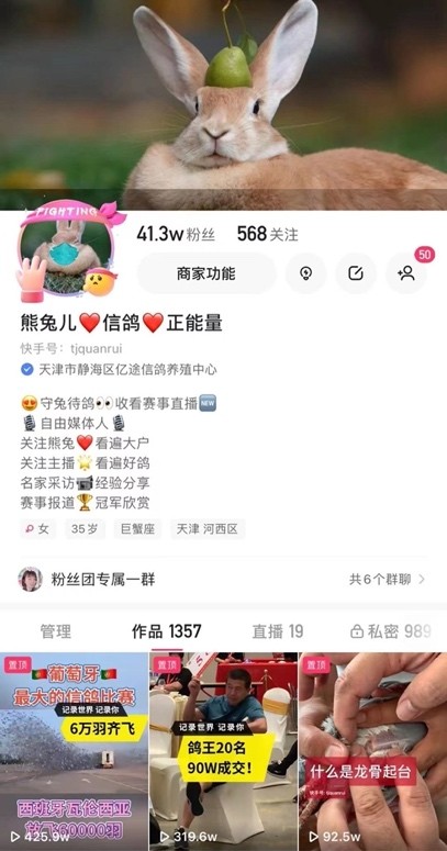 2018年,隨著快手等短視頻直播平臺興起,熊兔兒嘗試通過快手做了第一次直播,不到半年便漲粉10萬,“當(dāng)時(shí)就覺得直播這個(gè)新的方向特別好?!鄙钏际鞈]過后,頗具膽識和魄力的熊兔兒于2019年初全職運(yùn)營快手,一個(gè)人包攬“采、編、播”各環(huán)節(jié),開啟了單打獨(dú)斗的信鴿自媒體生涯。賬號創(chuàng)立至今,熊兔兒走訪全國各地的信鴿比賽和名家“鴿王”,在對行業(yè)前沿賽事進(jìn)行直播的同時(shí),通過多種途徑和表現(xiàn)形式傳播信鴿正能量文化,成為業(yè)內(nèi)小有名氣的賽鴿文化IP,并獲得快手頒發(fā)的動物寵物內(nèi)容生態(tài)貢獻(xiàn)獎(jiǎng)。
