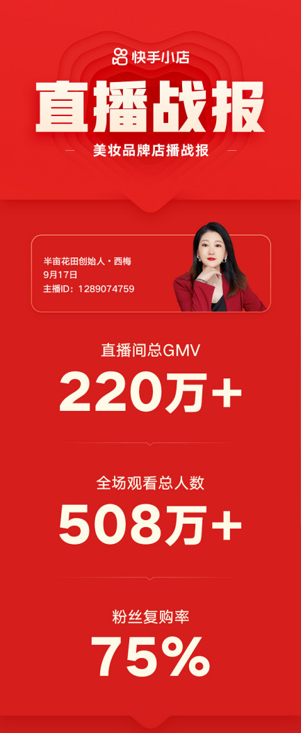 短視頻、直播電商等新興營銷方式正在重構(gòu)上億用戶的消費決策,而品牌自播無疑是今年直播行業(yè)最熱的話題。自今年8月開始在快手正式布局自播以來,短短1個月間,國貨護膚品牌半畝花田粉絲數(shù)量迅速突破300萬。在前不久的品牌寵粉日活動中,半畝花田更是成績亮眼:全場總觀看人數(shù)超508萬,總GMV突破220萬,粉絲復(fù)購率達到75%,實現(xiàn)了品牌銷量和口碑的雙效轉(zhuǎn)化。