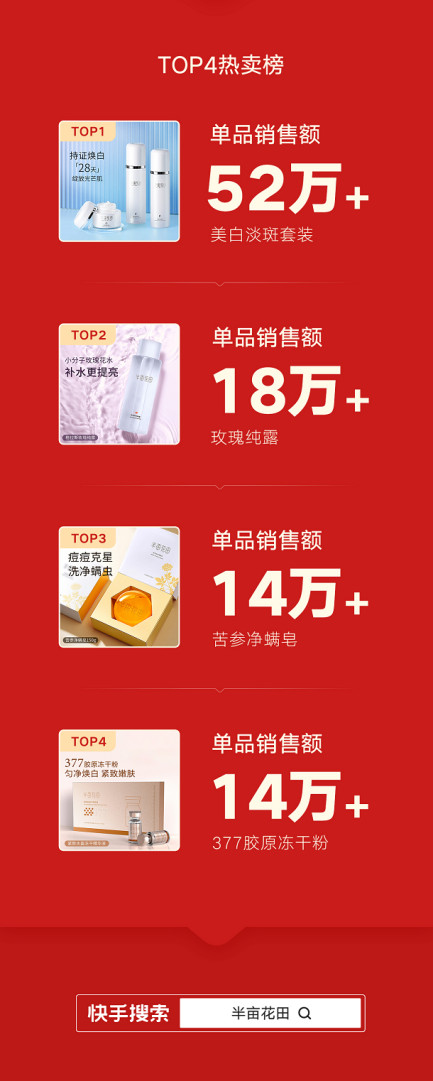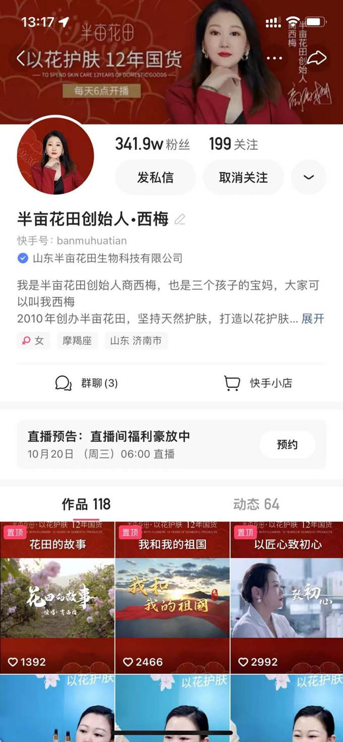 今年3月入駐快手以來,國貨護膚品牌半畝花田在摸索中逐漸認識到了這一點。相比其他平臺,以“內(nèi)容+私域”為主導(dǎo)的快手更像一個社區(qū),主播與老鐵們互動緊密,粉絲會因為信任主播而購買其推薦的商品。而對于創(chuàng)立超過10年、在快手用戶中認知“不是特別強”的半畝花田而言,破局的關(guān)鍵就在如何迅速建立粉絲信任感上。