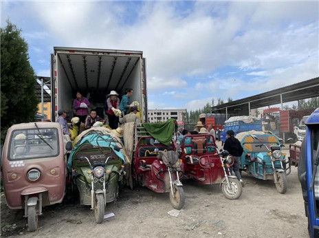 (清晨代辦點(diǎn)前,菜農(nóng)五彩的農(nóng)用小車一字排開(kāi),緊急裝菜運(yùn)輸出城)