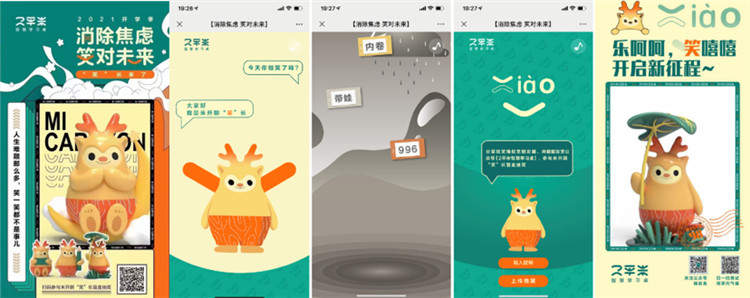 正值秋季開學(xué)季,新學(xué)期父母和孩子們難免焦慮迷茫??紤]到當(dāng)下“80后”“90后”家長的社交習(xí)慣,2平米借助微信平臺,用生動有趣的H5,以輕松快樂的方式引導(dǎo)用戶通過點擊消除“內(nèi)卷”“帶娃”“996”等焦慮詞匯,釋放自我,還可以上傳照片可以測試微笑元氣值,生成自帶精致格言的專屬海報。