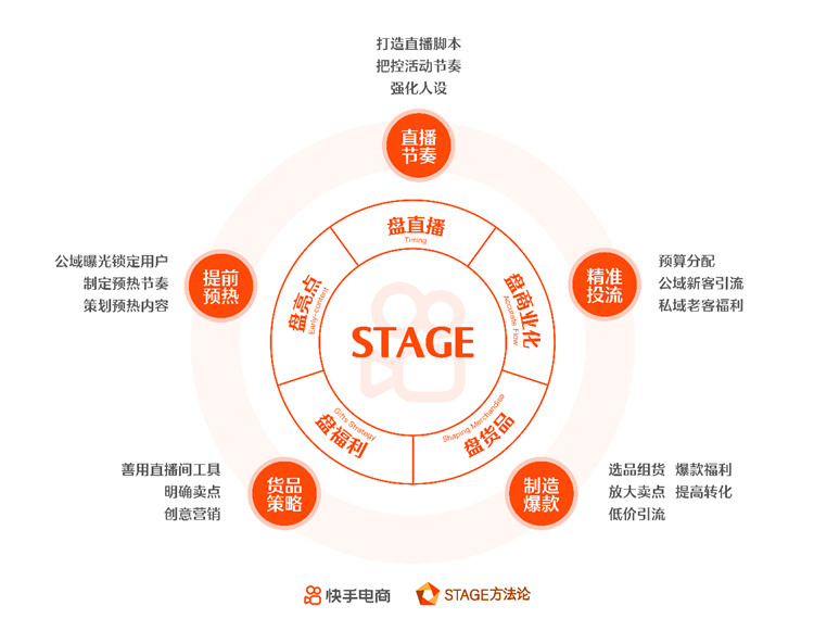 STAGE方法論包括盤貨品(Shaping Merchandise)、盤直播(Timing)、盤商業(yè)化(Accurate Flow )、盤福利(Gifts Strategy)、和盤亮點(Early-content)五個方面,是快手電商從海量電商直播中提煉出來的運營經(jīng)驗。