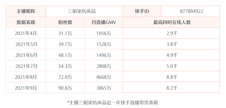 河北衡水的快手家紡主播三姐(快手ID:877884922)今年三四月時場均GMV只有25萬左右。四月份,快手電商運營小二開始對接扶持,鼓勵主播多發(fā)內(nèi)容,勤復(fù)盤,只用了兩三個月的時間,場均GMV就增長到了70至90萬。到7月份,三姐通過和外部服務(wù)商合作操盤大活動獲得全方位提升,單場峰值GMV突破了550萬。8月份,在她自己的努力下,單場峰值GMV突破1000萬,場均GMV可以到達200萬。相當(dāng)于不到半年的時間,三姐通過學(xué)習(xí)專業(yè)化運營實現(xiàn)了10倍的增長。目前,三姐的每一場直播都會更加系統(tǒng)性使用STAGE方法論。