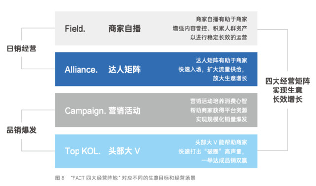 飛科的這一方法論總結(jié),其實正對應(yīng)著抖音電商的FACT矩陣模型:F (Field)商家自播,做品牌的日銷經(jīng)營基本盤;A (Alliance) 達(dá)人矩陣,幫助商家快速入局并擴(kuò)大影響力;C (Campaign) 營銷活動,以平臺之力實現(xiàn)規(guī)?;蜂N爆發(fā);T (Top-KOL) 頭部達(dá)人則是直接幫助商家打出聲量。