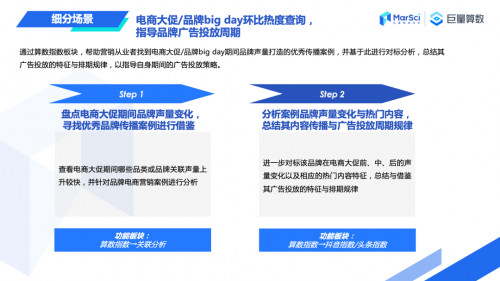 輔助指導(dǎo)廣告投放:在各個(gè)大促節(jié)點(diǎn)來臨前,巨量算數(shù)可以提供電商大促/品牌big day環(huán)比熱度查詢,基于此進(jìn)行對(duì)標(biāo)分析,指導(dǎo)品牌廣告投放周期;還可以分析影視綜媒體資源相關(guān)情況,幫助營(yíng)銷從業(yè)者高效地做出影視綜資源合作決策。