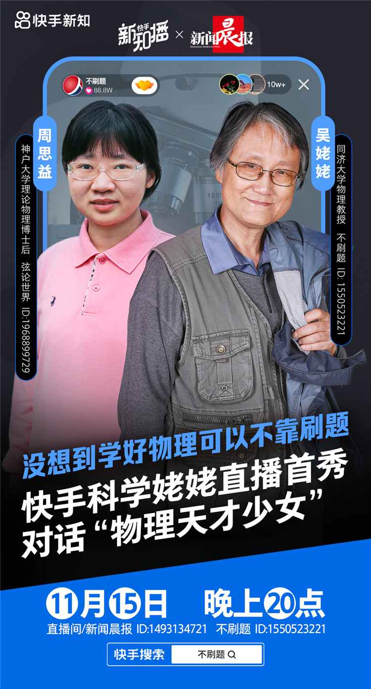 11月15日晚,被人民日報、央視新聞等眾多媒體接連報道、火遍全網(wǎng)的“快手科學(xué)姥姥”完成了她的直播首秀!這場直播活動由快手聯(lián)合上海新聞晨報舉辦,兩位女性物理學(xué)者和大伙兒一塊聊了聊物理學(xué)習(xí)的那些事兒。