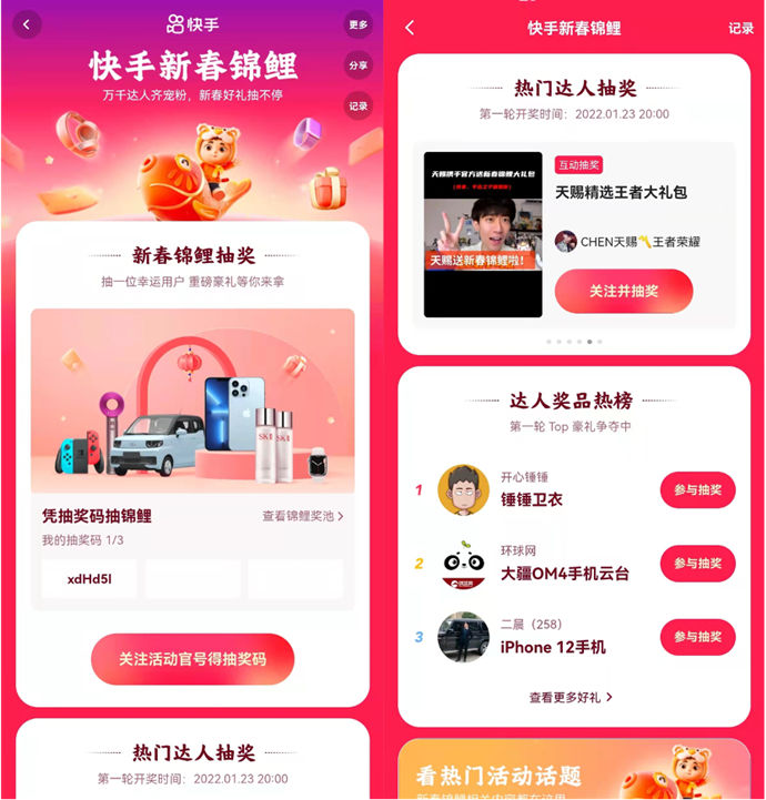 值得注意的是,快手還特別設(shè)置了新春錦鯉獎池。中獎人可獨(dú)享明星貼心好禮以及第一階段兩輪活動中產(chǎn)生的最受歡迎的Top200禮品等200+份好禮。