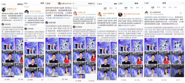 與此同時,針對站內(nèi)用戶,抖音電商以特色站內(nèi)挑戰(zhàn)賽玩法激發(fā)用戶參與興趣,用話題預(yù)埋、達(dá)人拍攝內(nèi)容短視頻等方式引起用戶自創(chuàng)內(nèi)容驅(qū)動用戶參與,形成自傳播擴(kuò)大聲勢。同時也為之后的big day、品牌自播等銷售環(huán)節(jié)進(jìn)行用戶種草和流量蓄水。截至目前,站內(nèi)話題#發(fā)現(xiàn)新勢力品牌 話題播放量已超過3100萬次,該話題在微博端閱讀量已超過1.1億,微博話題#新消費改變了什么#閱讀量也近5900萬次,產(chǎn)生近5萬人次討論。