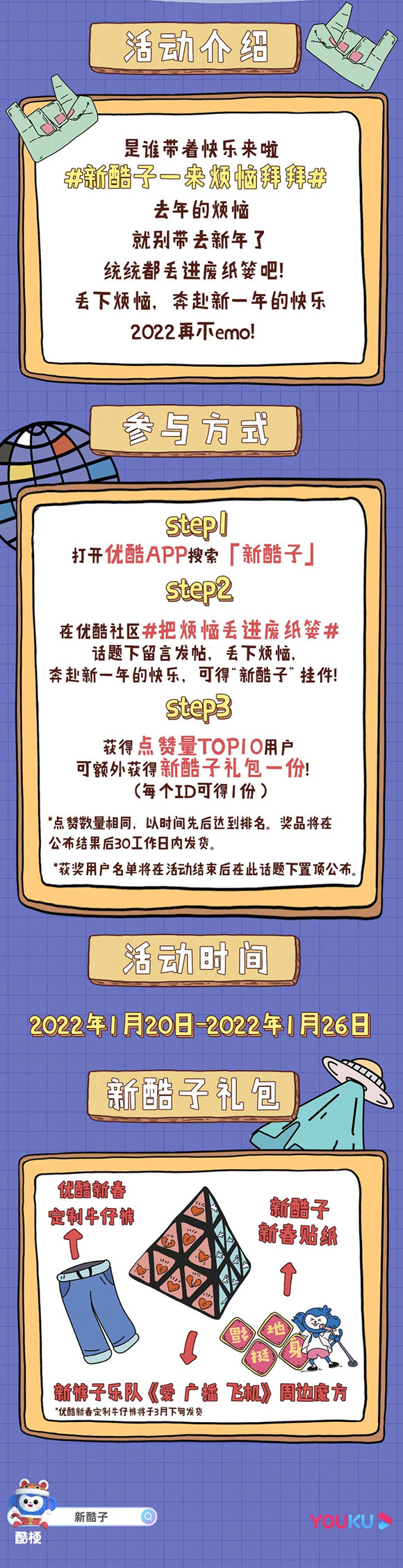 為將「掃除煩惱」的目標(biāo)落到實(shí)處,在內(nèi)容之外,優(yōu)酷還以社區(qū)平臺(tái)酷梗進(jìn)行承接,發(fā)起「把煩惱丟進(jìn)廢紙簍」的號召,邀請年輕用戶分享生活的苦惱,讓那些積攢已久、難以對身邊人開口的困擾,通過傾訴得到紓解。在社區(qū)中,用戶也可以從與其他人的交流中,找到互相理解的共鳴。優(yōu)酷還為部分參與活動(dòng)的用戶送上有趣而治愈的「新酷子禮包」,幫助他們與煩惱徹底告別。