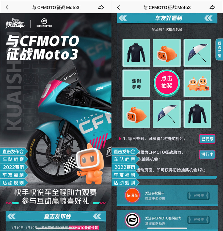 同時,自2月1日起,用戶帶該話題發(fā)布MOTOGP?賽事和CFMOTO Racing PrüstelGP車隊相關(guān)視頻,有幾率獲得車手簽名帽子、CFMOTO定制衛(wèi)衣等禮品。該活動將一直持續(xù)到11月18日,覆蓋MOTOGP?比賽全程。