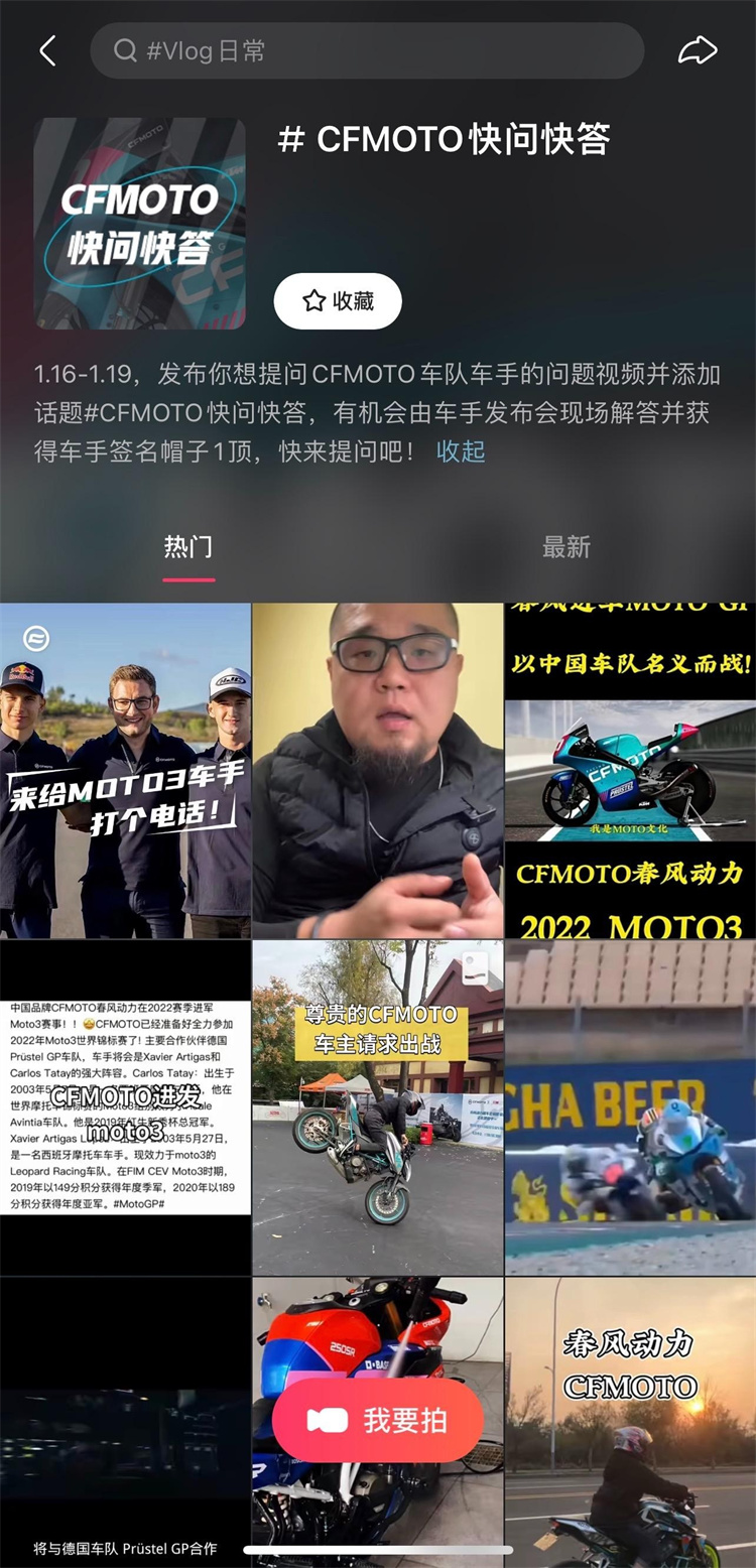除了問答活動,快手還建立了賽事專屬話題#CFMOTO征戰(zhàn)Moto3,世界頂級賽事熱點(diǎn)話題吸引了眾多摩托車圈內(nèi)大咖積極分享權(quán)威看點(diǎn)。用戶在話題下不僅可以與專業(yè)賽事達(dá)人一起交流討論,還可以即時、迅速地獲取最新賽事資訊,觀看CFMOTO Racing PrüstelGP車隊高能表現(xiàn)。