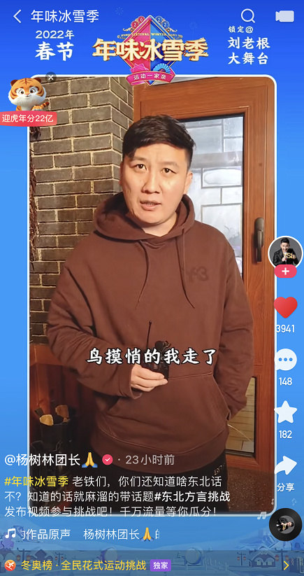 在快手年味冰雪季的系列活動中,東北方言挑戰(zhàn)也引發(fā)了網(wǎng)友們的踴躍參與。不少人開玩笑稱,東北話作為除普通話外的第二個全國通用語言早已深入人心,用心的劉老根大舞臺成員也紛紛拿出了壓箱底的方言展示。