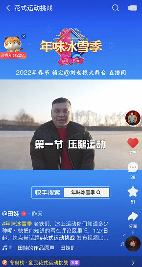 慶冬奧、迎新年,近日,快手聯(lián)合劉老根大舞臺打造冬季運動題材聯(lián)歡活動——年味冰雪季,圍繞“冬奧”、“冰雪”、“新年”為關(guān)鍵詞,展開一系列的花式冰雪玩法。目前,快手已上線花式運動挑戰(zhàn)、東北方言挑戰(zhàn)等內(nèi)容,宋曉峰、劉小光、楊樹林、王小利等一眾劉老根大舞臺成員在相關(guān)話題頁發(fā)布作品,展現(xiàn)不為人知的東北版冰雪技能。