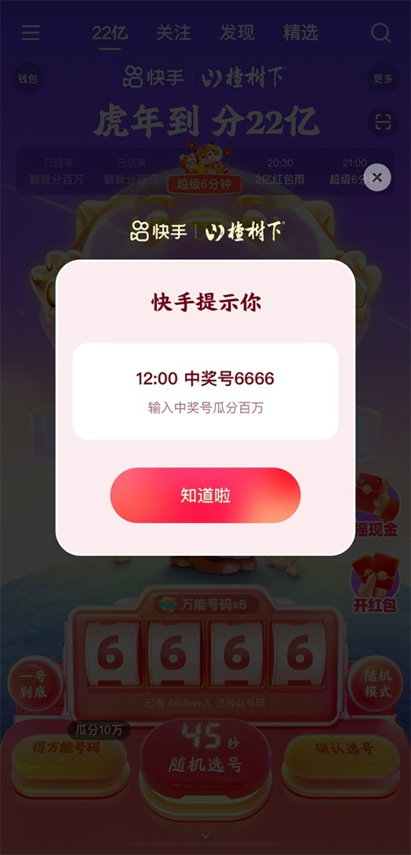 1月30日晚11點起,用戶打開快手,點擊頁面上方的“22億”標簽,或搜索“分22億”即可進入“選號抽獎”活動頁面。