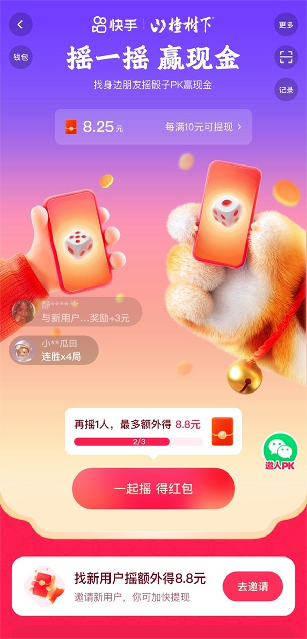 “搖一搖”玩法需要用戶找到附近好友通過搖骰子的方式進行PK,獲勝一方有機會贏取現(xiàn)金,有了它,再也不擔心過年在家和親戚面面相覷了。