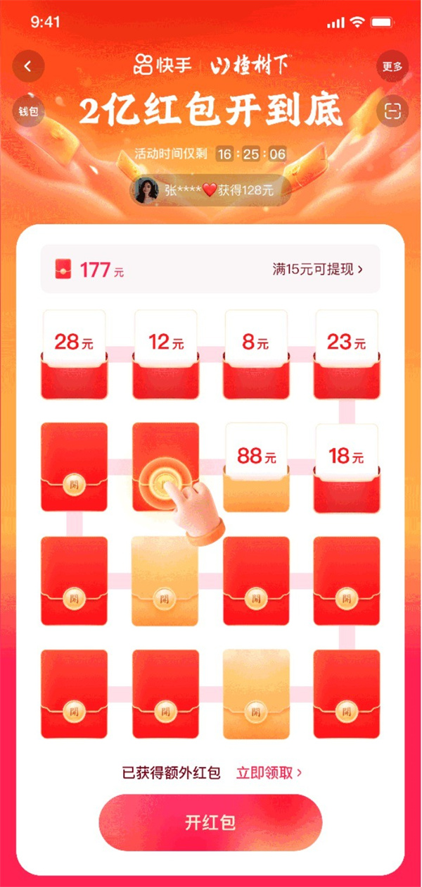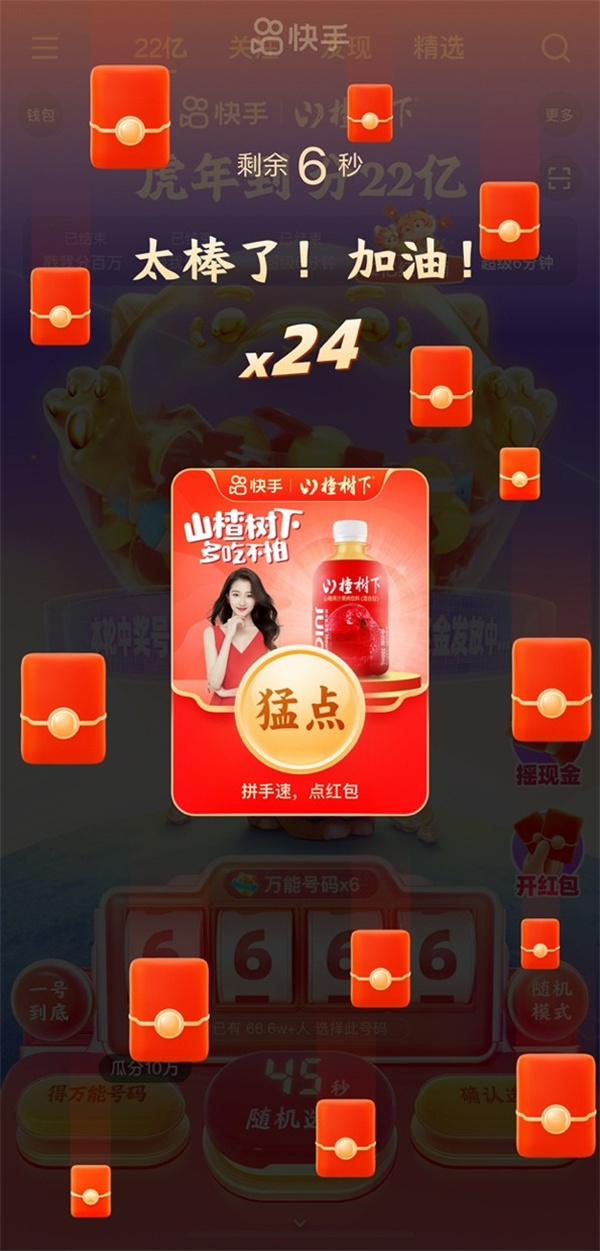 此外,20點整、21點整、22點整、23點整,每整點快手還會開啟“超級六分鐘”,加碼紅包金額,在6分鐘的時間里分千萬紅包。