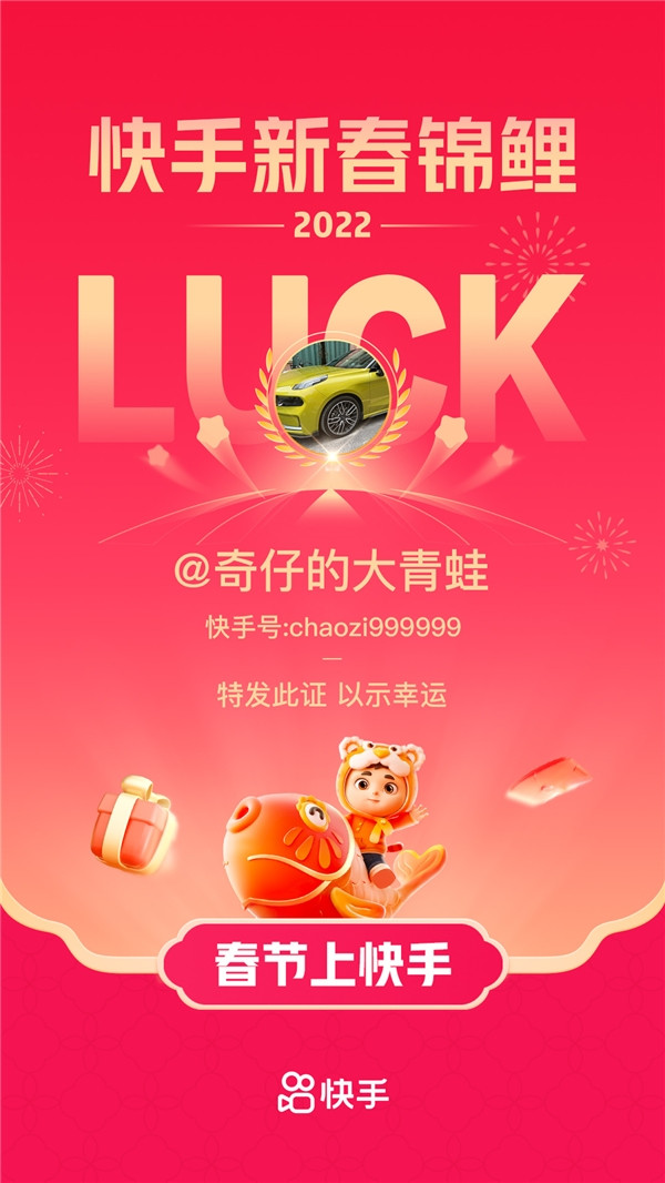 “奇仔的大青蛙”在獲得錦鯉大獎后激動表示,自己長這么大從來沒有中過獎,沒想到這次能有幸成為快手新春錦鯉?!拔覐?016年開始用快手,也經(jīng)常分享和記錄自己的生活,希望能在快手上把我的好運也傳遞給更多用戶”,該用戶興奮地表示。
